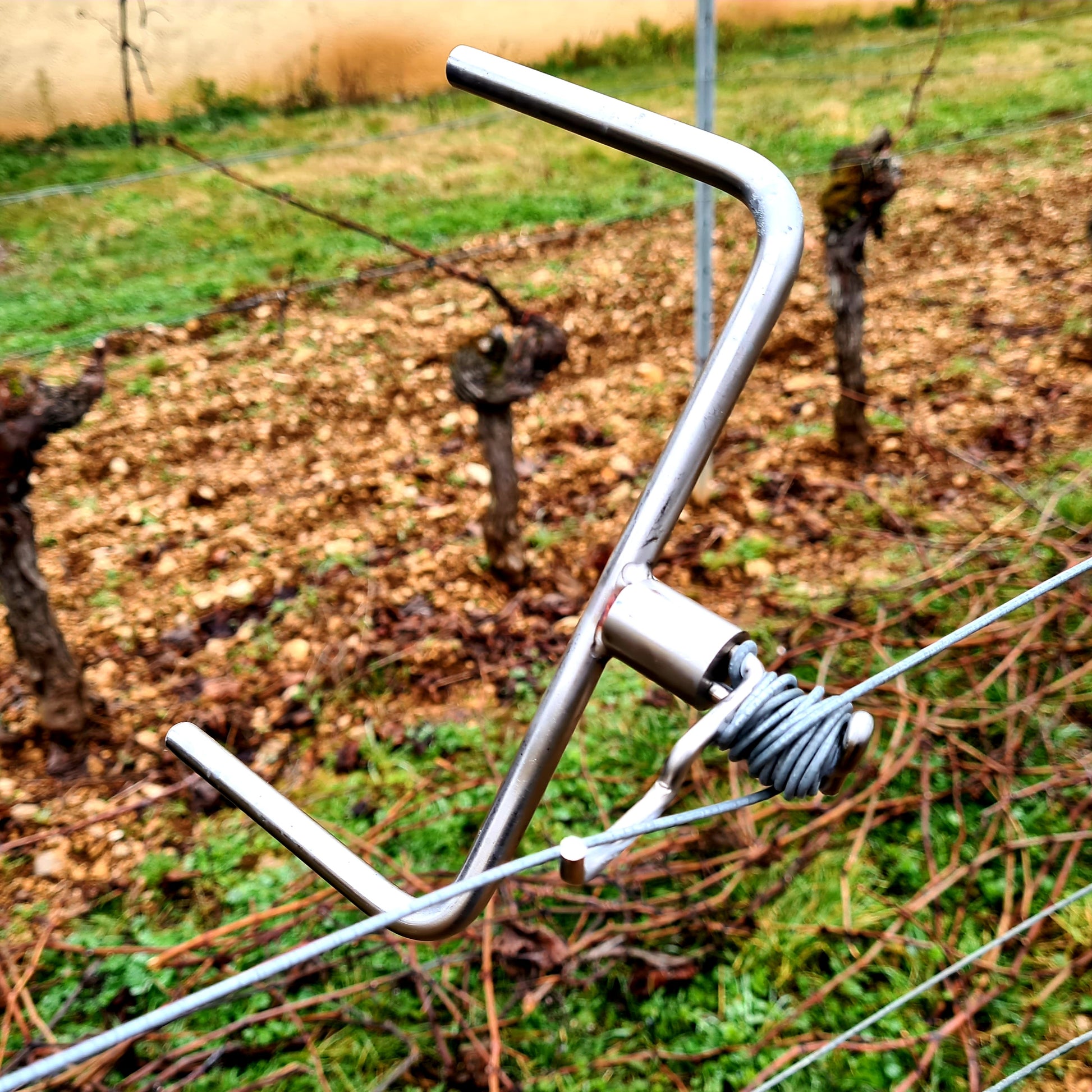 Le tendeur Coutale permet d’avoir une forte tension nécessaire dans les longues rangées de vigne.